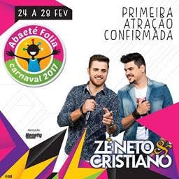 Uma semana após anunciar o início das vendas de abadás para o Abaeté Folia 2017, a Nenety Eventos confirma a primeira atração do evento: Zé Neto & Cristiano. Os sertanejos serão a atração principal de uma das noites do Melhor de Minas, que chega à sua 11ª edição com uma mega estrutura que será montada no Campo do Abaeté (Rua Dr. Antônio Amador, Nº120, Centro, Abaeté-MG).