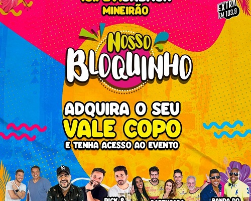 Sucesso nas edições anteriores, o “Nosso Bloquinho”, evento que reuniu nomes de destaque do axé e do sertanejo, volta no ano de 2020 para animar ainda mais o pré-carnaval. Desta vez, a festa acontece no dia 15 de fevereiro, sábado, a partir das 15h, no Mineirão (Avenida Antônio Abrahão Caram, 1001 – São José) trazendo nomes cotados, como, Baianeiros, Hott, Rick e Nogueira, Bartucada e Banda do Marcão. A festa tem promoção exclusiva da rádio Extra FM e o acesso para o “Nosso Bloquinho” será realizado através da compra do copo personalizado do evento pela Central dos Eventos pelo www.centraldoseventos.com.br . E você, vai ficar de fora dessa?